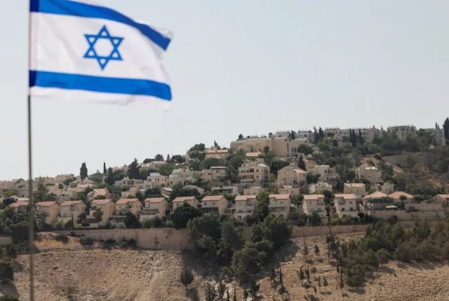 ایک اسرائیلی جھنڈا لہرا رہا ہے، جیسا کہ مالے ادومیم کی اسرائیلی بستی کے ایک حصے کے پس منظر میں، اسرائیل کے زیر قبضہ مغربی کنارے، فلسطین، 14 اگست 2025 کو دکھائی دے رہا ہے۔ تصویر: REUTERS