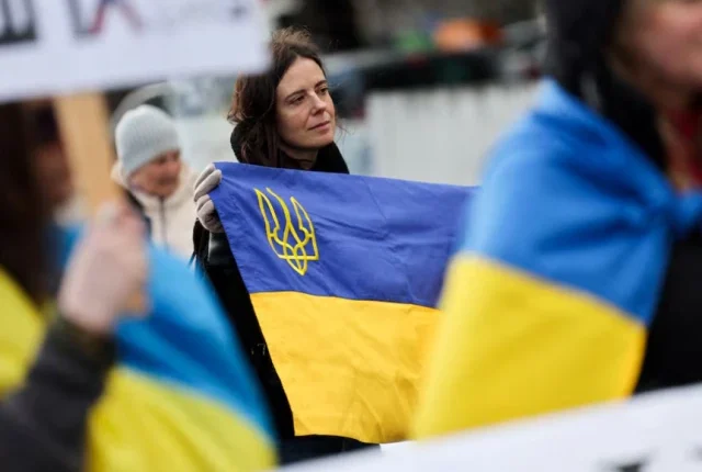 جنیوا، سوئٹزرلینڈ، 17 فروری 2026 کو روس اور یوکرین کے درمیان امریکہ کی ثالثی میں ہونے والے امن مذاکرات کے دن، اقوام متحدہ کے دفتر کے قریب ایک مظاہرے میں ایک خاتون یوکرین کا جھنڈا اٹھائے ہوئے ہے۔ تصویر: REUTERS