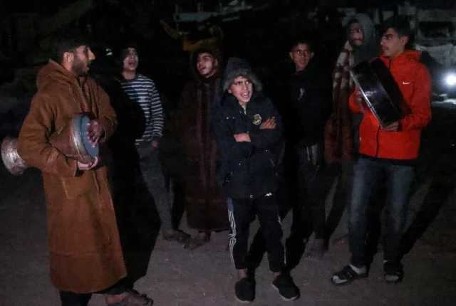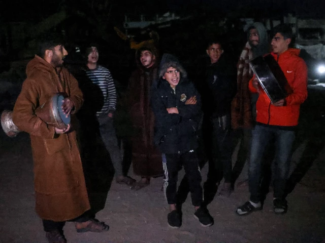 ایک فلسطینی "مشاراتی”، جو رمضان کے مقدس مہینے میں دن کے روزے کے آغاز سے پہلے فجر سے پہلے کے روایتی "سحری” کھانے کے لیے مسلمانوں کو بیدار کرنے والے "رمضان ڈرمر” کا روایتی کردار ادا کر رہا ہے، اپنا دورہ جنوبی غزہ کی پٹی میں خان یونس میں کر رہا ہے، جو کہ 1 فروری، 26 AF کو روزے کے پہلے دن کے موقع پر۔