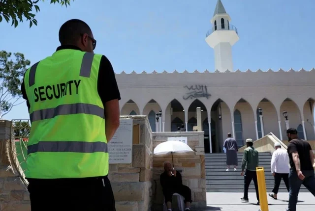 14 دسمبر کو سڈنی، آسٹریلیا میں، 19 دسمبر، 2025 کو بونڈی بیچ پر یہودی ہنوکا کی تقریب کے دوران مہلک اجتماعی فائرنگ کے بعد سخت حفاظتی موجودگی کے درمیان، ایک سیکیورٹی گارڈ لکیمبا امام علی بن ابی طالب مسجد کے باہر کھڑا ہے۔ تصویر: