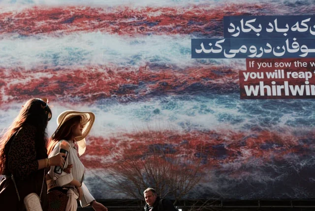 ایرانی خواتین 19 فروری 2026 کو تہران، ایران میں امریکہ مخالف بل بورڈ کے پاس سے گزر رہی ہیں۔ REUTERS