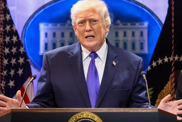 امریکی صدر ڈونلڈ ٹرمپ اشارہ کر رہے ہیں جب وہ وائٹ ہاؤس میں پریس بریفنگ کے دوران تقریر کر رہے ہیں، سپریم کورٹ کے اس فیصلے کے بعد کہ ٹرمپ نے 20 فروری 2026 کو واشنگٹن، ڈی سی، یو ایس میں محصولات عائد کرتے وقت اپنے اختیار سے تجاوز کیا تھا۔ تصویر: رائٹرز