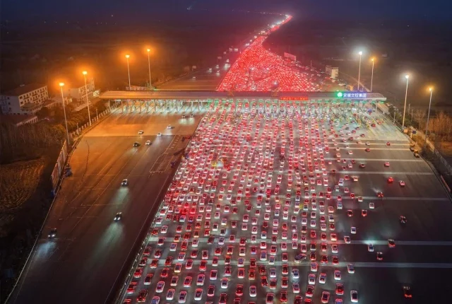 22 فروری 2026 کو گھوڑوں کے سال کے موقع پر بہار کے تہوار کی تعطیل کے اختتام پر، مشرقی چین کے صوبہ انہوئی کے چوزہو میں ووزوانگ ٹول اسٹیشن سے گزرنے کے بعد ڈرائیور ایکسپریس وے کی لین میں ضم ہو گئے۔ تصویر: اے ایف پی