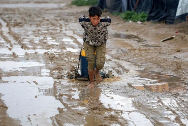 24 فروری 2026 کو وسطی غزہ کی پٹی میں فلسطینی پناہ گزینوں کے بوریج کیمپ میں شدید بارش کے بعد ایک ننگے پاؤں لڑکا کیچڑ والی سڑک پر پانی کا کنٹینر کھینچ رہا ہے۔ تصویر: اے ایف پی