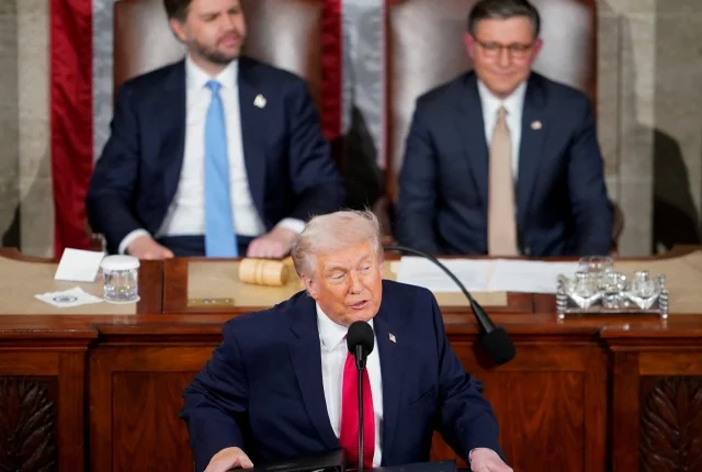 امریکی صدر ڈونلڈ ٹرمپ 24 فروری 2026 کو واشنگٹن ڈی سی میں یو ایس کیپیٹل کے ہاؤس چیمبر میں اسٹیٹ آف دی یونین خطاب کررہے ہیں۔ تصویر: REUTERS
