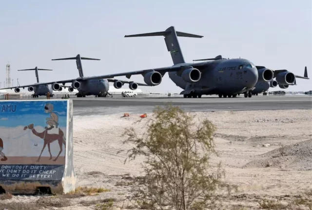 دوحہ، قطر میں العدید ایئر بیس پر امریکی فضائیہ کے C-17 گلوب ماسٹر طیاروں کا عمومی منظر۔ فوٹو: رائٹرز