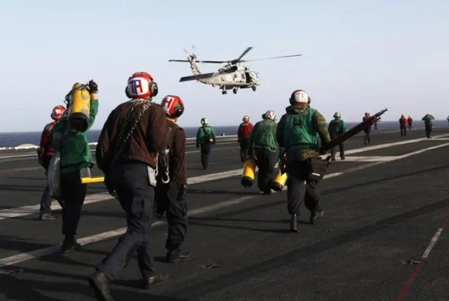 فلائٹ ڈیک کے اہلکار 14 فروری 2012 کو آبنائے ہرمز ٹرانزٹ کے دوران خلیج عرب میں گشت کرتے ہوئے نمٹز کلاس طیارہ بردار بحری جہاز USS ابراہم لنکن (CVN 72) پر فلائٹ ڈیک پر اترنے کی تیاری کر رہے ہیلی کاپٹر کو وصول کرنے کے لیے دوڑ رہے ہیں۔ تصویر: REUTERS
