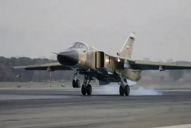 16 اپریل 2009 کو ایران کے شہر تہران میں شاہد لشکری ٹیکٹیکل ایئر بیس (TAB-1) پر اسلامی جمہوریہ ایران کی فضائیہ کی فوجی مشق کے دوران ایک سخوئی Su-24M Fencer D طیارہ رن وے پر اتر رہا ہے۔ تصویر: اے ایف پی/گیٹی