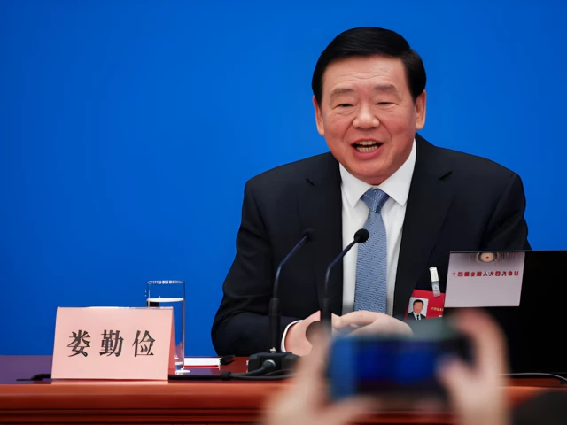 نیشنل پیپلز کانگریس (این پی سی) کے ترجمان لو کنجیان ایک پریس کانفرنس کے دوران گفتگو کر رہے ہیں۔ فوٹو: رائٹرز