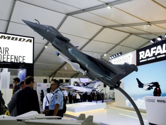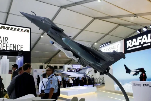 ستمبر 2024 میں کوٹا، بالی، انڈونیشیا میں بین الاقوامی بالی ایئر شو کے دوران رافیل لڑاکا طیارے کا ماڈل دکھایا گیا ہے۔ تصویر: رائٹرز