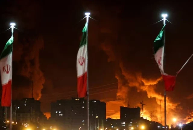 تہران، ایران میں، ایران پر اسرائیلی حملوں کے بعد، شاران آئل ڈپو پر اسرائیلی حملے سے آگ اور دھواں اٹھتے ہوئے ایرانی پرچم لہرا رہے ہیں۔ تصویر: رائٹرز