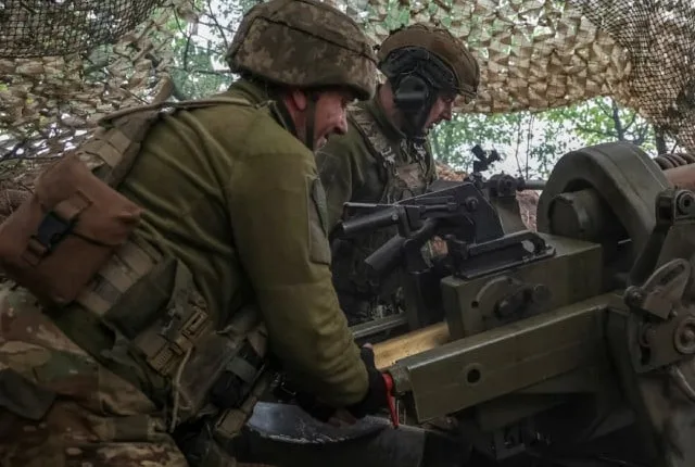 یوکرائنی سروس کے ارکان 21 اپریل 2024 کو روسی فوجیوں، ڈونیٹسک کے علاقے کی طرف L119 ہووٹزر فائر کر رہے ہیں۔ تصویر: رائٹرز