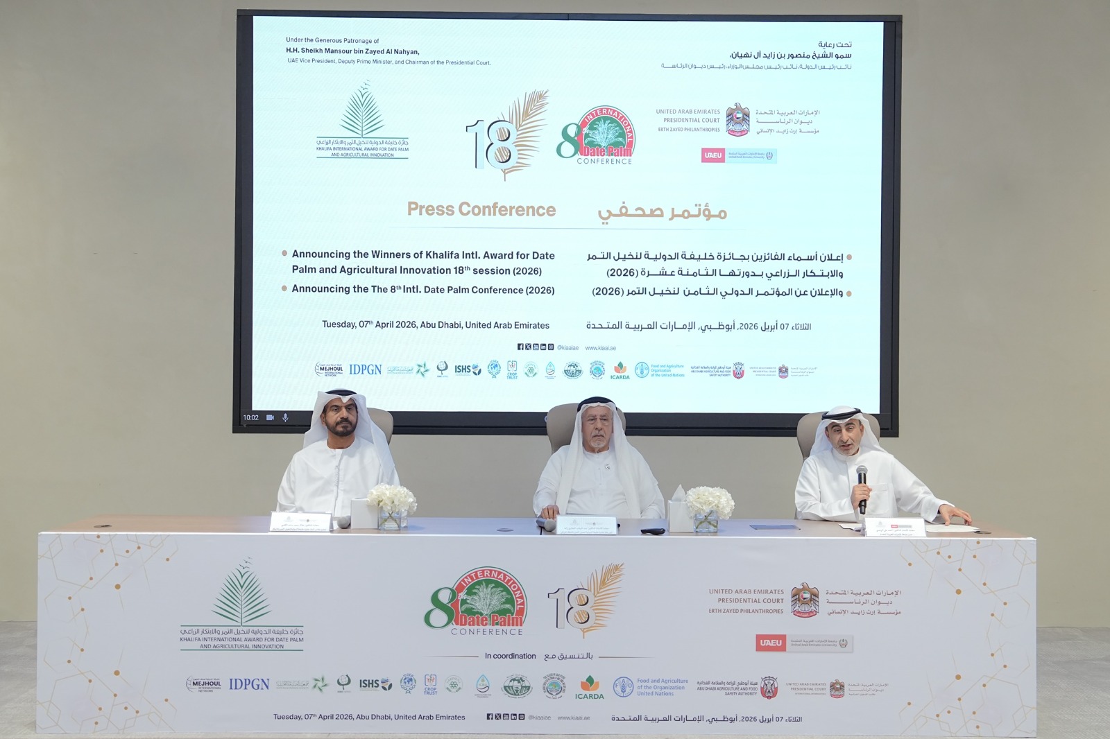 ایوارڈ کے سیکرٹری جنرل نے بھی 8ویں بین الاقوامی کھجور کی کانفرنس میں تمام شرکاء کی تعریف کی، جو 28 اپریل سے 1 مئی 2026 تک ابوظہبی کے ایمریٹس پیلس میں منعقد ہو گی۔ انہوں نے بتایا کہ کانفرنس میں ایک اعلیٰ سطحی سیشن شامل ہو گاانہوں نے کہا کہ کانفرنس میں فیصلہ سازوں کے لیے ایک اعلیٰ سطحی مکمل سیشن شامل ہوگا جس میں زراعت کے مدعو وزراء اور علاقائی اور بین الاقوامی تنظیموں کے متعدد ڈائریکٹرز کی شرکت ہوگی۔ اس کے علاوہ، پوری کانفرنس میں پانچ سائنسی سیشنز تقسیم کیے جائیں گے۔