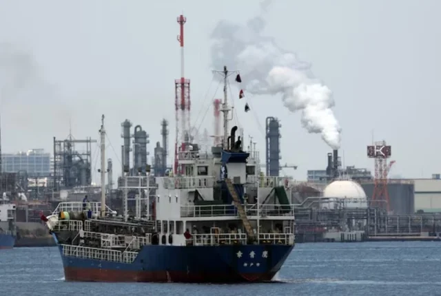 17 مارچ 2026 کو جاپان کے ٹوکیو کے جنوب میں، کاواساکی میں کیہین انڈسٹریل زون میں، ایک آئل ریفائنری کے قریب ایک چھوٹا ٹینکر روانہ ہو رہا ہے۔ تصویر: REUTERS