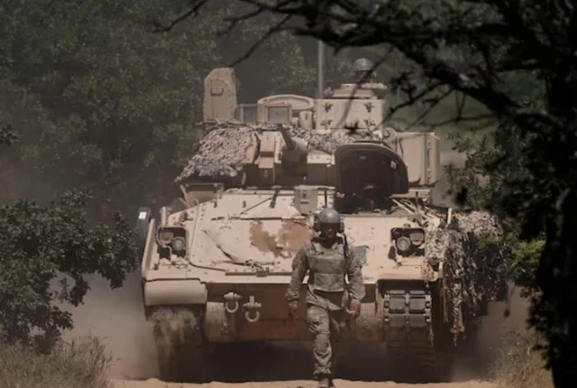 ایک امریکی فوجی "بلقان سینٹینیل – 25” فوجی مشق کے دوران ایک بکتر بند گاڑی کے آگے چل رہا ہے، بلغاریہ کی لینڈ فورسز اور فضائیہ کے عملے اور سازوسامان پر مشتمل ایک مشق، اٹلی کے ساتھ نیٹو کے کثیر القومی جنگی گروپ کی تشکیل، اور رومانیہ کی زمینی افواج کی ایک مشینی پلاٹون، کورین، بلغاریہ، جون 29، 29، تصویر: