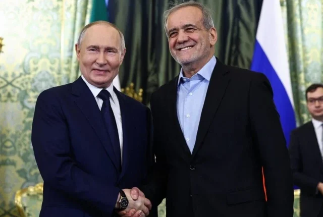 17 جنوری 2025 کو روس کے صدر ولادیمیر پوٹن اور ایرانی صدر مسعود پیزشکیان مصافحہ کر رہے ہیں۔ تصویر: REUTERS