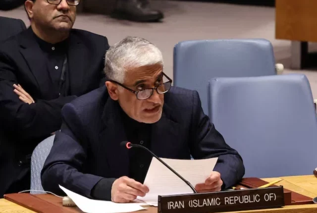 اقوام متحدہ میں ایران کے سفیر امیر سعید ایرانی، 11 مارچ 2026 کو نیویارک شہر میں اقوام متحدہ کے ہیڈ کوارٹر میں ایران اور مشرق وسطیٰ کی صورت حال سے متعلق قراردادوں پر اقوام متحدہ کی سلامتی کونسل کے ارکان سے خطاب کر رہے ہیں۔ تصویر: REUTERS