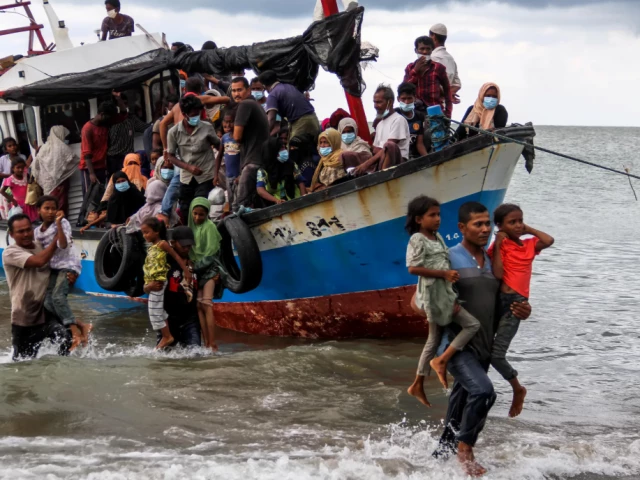 مقامی لوگ روہنگیا مہاجرین کو ایک کشتی سے نکال رہے ہیں جو جون 2020 میں انڈونیشیا کے سماٹرا جزیرے کے شمالی ساحل پر ساحل پر آئی تھی۔ تصویر: REUTERS