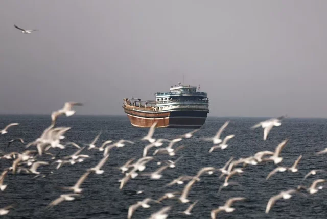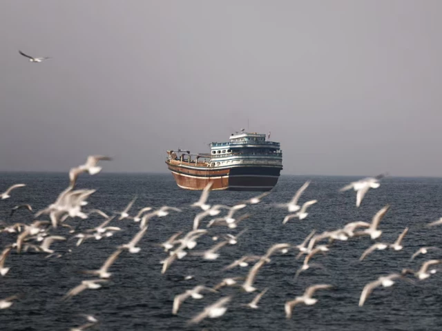 ایران کے ساتھ امریکہ اسرائیل تنازعہ کے درمیان آبنائے ہرمز میں ایک کشتی کے قریب پرندے اڑ رہے ہیں، جیسا کہ مسندم، عمان سے 2 مارچ 2026 کو دیکھا گیا ہے۔ تصویر: رائٹرز