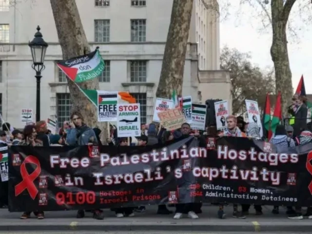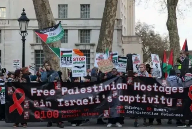 فلسطین کے حامی مظاہرین 31 مارچ 2026 کو لندن، برطانیہ میں ایک مجوزہ اسرائیلی قانون کے خلاف احتجاج کرنے کے لیے ڈاؤننگ سٹریٹ کے باہر جمع ہو رہے ہیں جو فلسطینی قیدیوں کو سزائے موت دینے کی اجازت دے گا۔