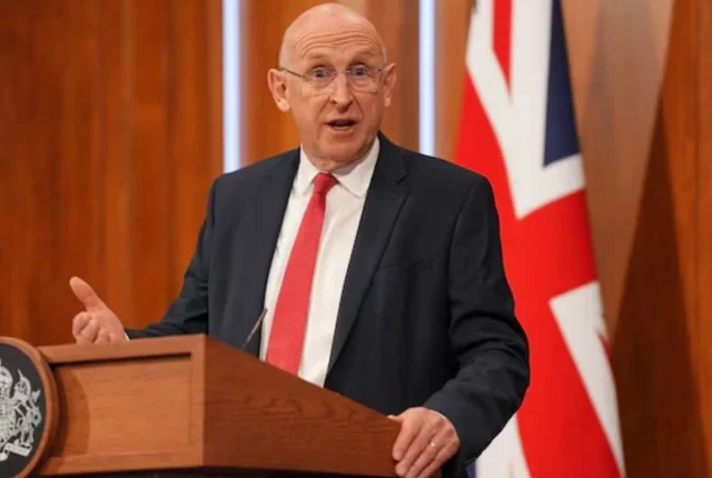 برطانیہ کے وزیر دفاع جان ہیلی 9 اپریل 2026 کو برطانیہ کی 9 ڈاؤننگ سٹریٹ میں بیان دے رہے ہیں۔ تصویر: REUTERS
