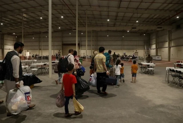 افغانستان سے خصوصی تارکین وطن 20 اگست 2021 کو قطر کے کیمپ آس سائلیہ میں انخلاء کے بعد زیر عمل عمارت سے گزر رہے ہیں۔ امریکی فوج/ سارجنٹ۔ جمی بیکر/ ہینڈ آؤٹ بذریعہ REUTERS