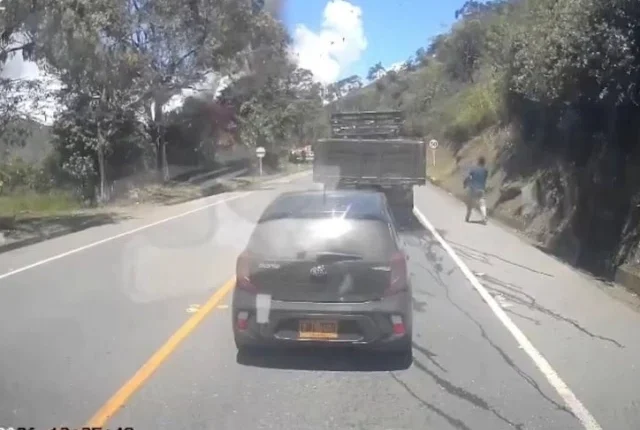 ڈیش کیم فوٹیج میں ایک شخص کو دوڑتے ہوئے دکھایا گیا ہے جب 25 اپریل 2026 کو کولمبیا کے کاجیبیو، کاکا میں، ایک درجن سے زائد افراد کی موت ہونے والے دھماکے کے وقت ملبہ فضا میں اڑتا ہے۔ REUTERS