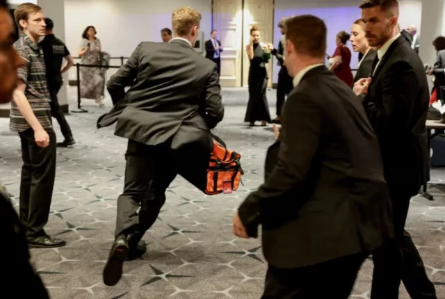 سیکرٹ سروس کے ایجنٹوں نے تیزی سے ٹرمپ اور وینس کو لمبی سر کی میز سے ہٹا دیا، حالانکہ کابینہ کے بہت سے ارکان اور قانون سازوں کے حفاظتی ایجنٹ – صحافیوں اور ان کے مہمانوں کے ساتھ فرش پر بیٹھے ہوئے – نے مختلف انداز میں رد عمل کا اظہار کیا۔ کچھ ایجنٹس بھرے بال روم میں گھس آئے، کرسیوں پر کھڑے ہو کر دسترخوان کو الٹ پلٹ کر محافظوں تک پہنچ گئے، جب کہ حیران مہمان میزوں کے نیچے دب گئے۔
