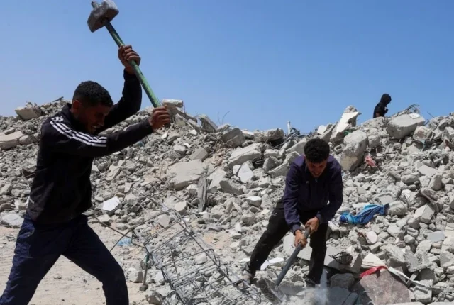 19 اپریل 2026 کو جنوبی غزہ کی پٹی کے خان یونس میں فلسطینی کارکن ملبے پر کام کرتے ہوئے کنکریٹ توڑ رہے ہیں۔ تصویر: REUTERS