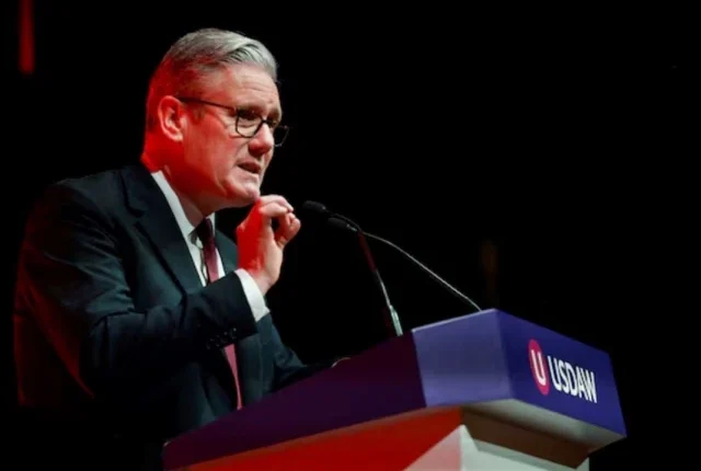 برطانوی وزیر اعظم کیئر اسٹارمر 27 اپریل 2026 کو بلیک پول، برطانیہ میں ونٹر گارڈنز بلیک پول میں یونین آف شاپ، ڈسٹری بیوٹیو اینڈ الائیڈ ورکرز (USDAW) کے سالانہ مندوبین کے اجلاس میں تقریر کر رہے ہیں۔ REUTERS