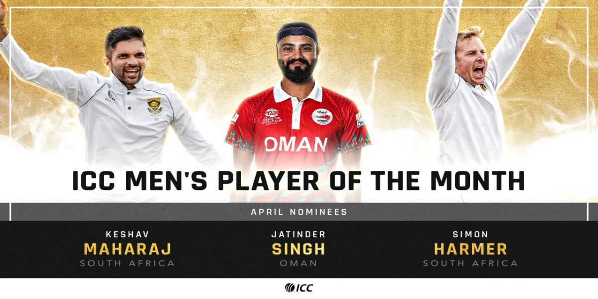 آئی سی سی نے مینز پلیئر آف دی منتھ کی نامزدگیوں کا اعلان کیا ہے جس میں پہلا نمبر جنوبی افریقہ کے بائیں ہاتھ کے اسپنر کیشو مہاراج کا ہے جو ان دنوں فل فارم میں موجود ہیں۔