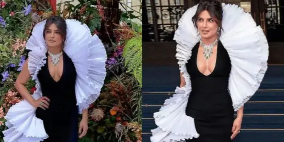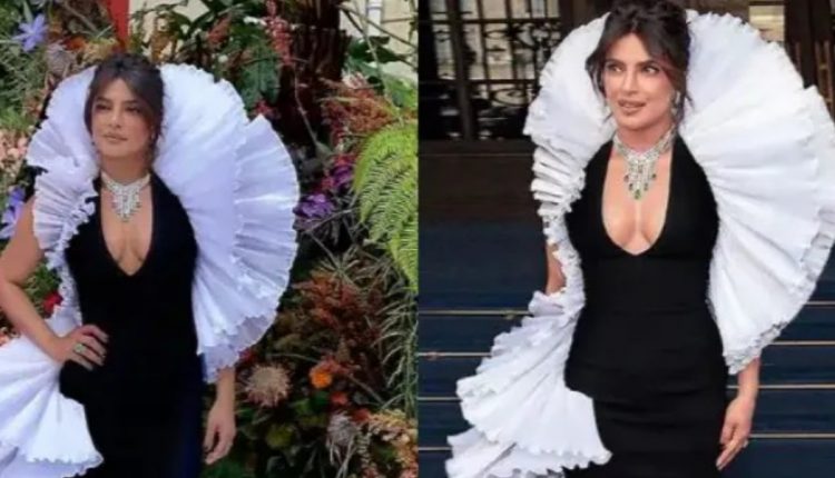 Priyanka Chopra was snapped heading to another event and she turned head with her appearance in a skinny black gown with striking white ruffles, after attending the Paris presentation of Bulgari’s 2018 jewellery line.