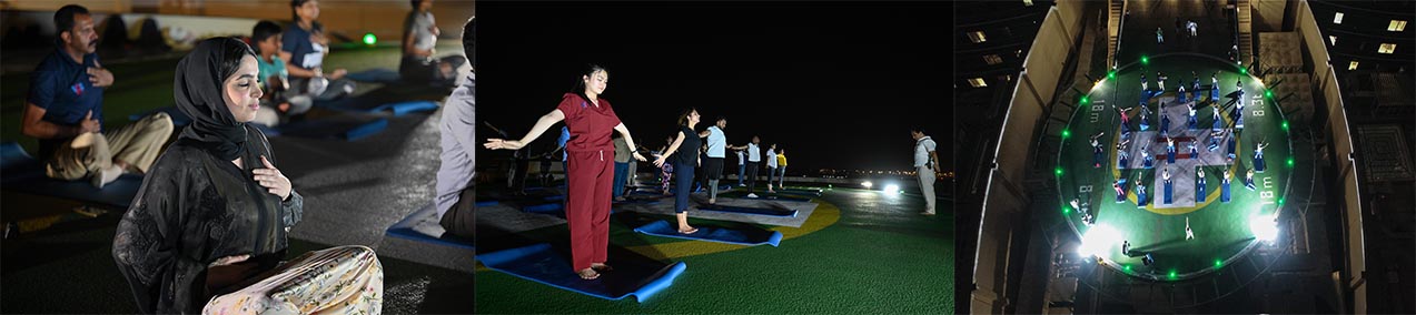 یو اے ای میں بین الاقوامی یوگا ڈے کی تقریبات کا آغاز ہیلی پیڈ پر فل مون یوگا کے ساتھ، صنعتی کارکنوں کے لیے یوگا