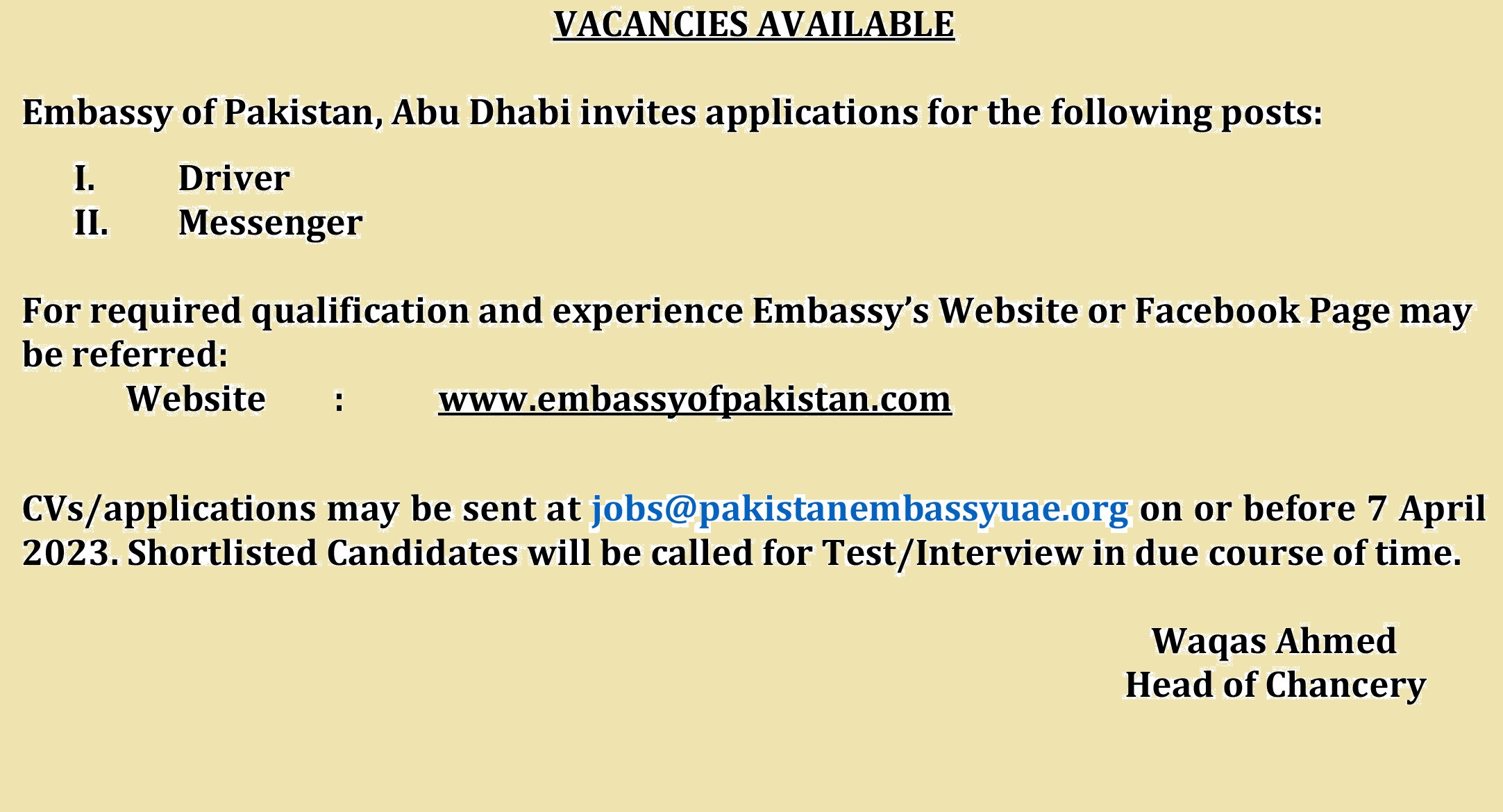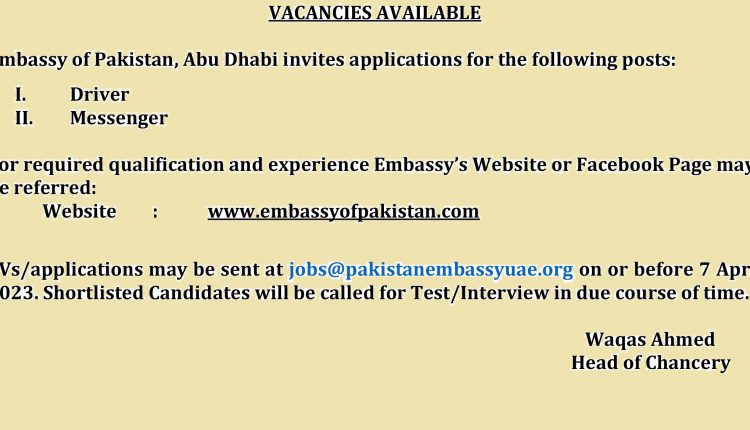 ابوظہبی(اردوویکلی)::سفارت خانہ پاکستان ابوظہبی میں ڈرائیور اور میسنجر کی آسامیاں خالی ہیں درج ذیل آسامیوں کے لیئے مطلوبہ اہلیت کے امیدواران سے درخواستیں مطلوب ہیں