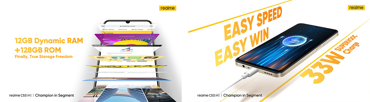 اسے اب تک کا سب سے زیادہ خلل ڈالنے والا انٹری لیول اسمارٹ فون قرار دیتے ہوئے،رئیل می نے کہا کہ رئیل می سی53 چیمپیئن کی میراث کو جاری رکھے ہوئے ہے، ایک بار پھر انٹری لیول کی جگہ کو سیگمنٹ کی صف اول کی خصوصیات کے ساتھ نئے سرے سے متعین کرتا ہے – 33واٹ تیز چارج، 12جی بی ریم تک متحرک ریم اور 128جی بی بڑی اسٹوریج – سیگمنٹ اور رئیل می سی سیریز میں 7.49ملی میٹر الٹرا سلم باڈی میں لپٹی ہوئی ہے۔