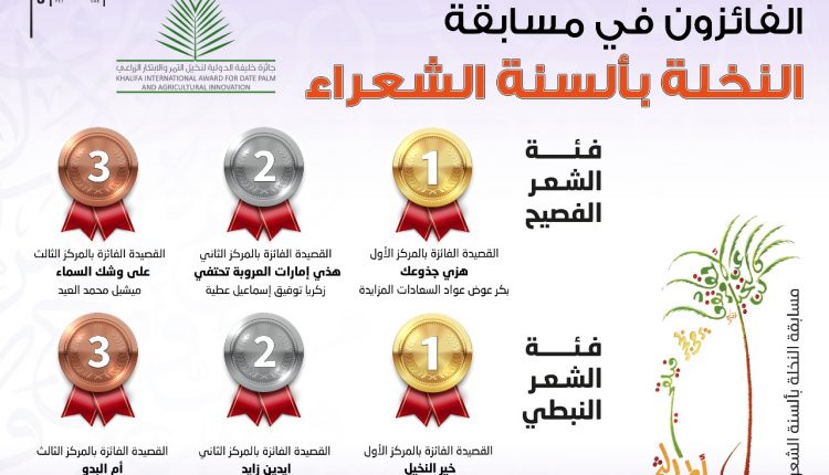 ابوظہبی(ویب ڈیسک)::خلیفہ انٹرنیشنل ایوارڈ فار ڈیٹ پام اینڈ ایگریکلچرل انوویشن جنرل سیکرٹریٹ نے اپنے 8ویں سیشن (2024) میں "ڈیٹ پام انٹرنیشنل پوئٹری” مقابلے کے فاتحین کا اعلان کیا، جو کہ وزیربرائے رواداری و بقائے باہمی ،ایوارڈ کے بورڈ آف ٹرسٹیز کے چیئرمین عزت مآب شیخ نہیان مبارک النہیان،کی سرپرستی میں منعقد ہوا۔
