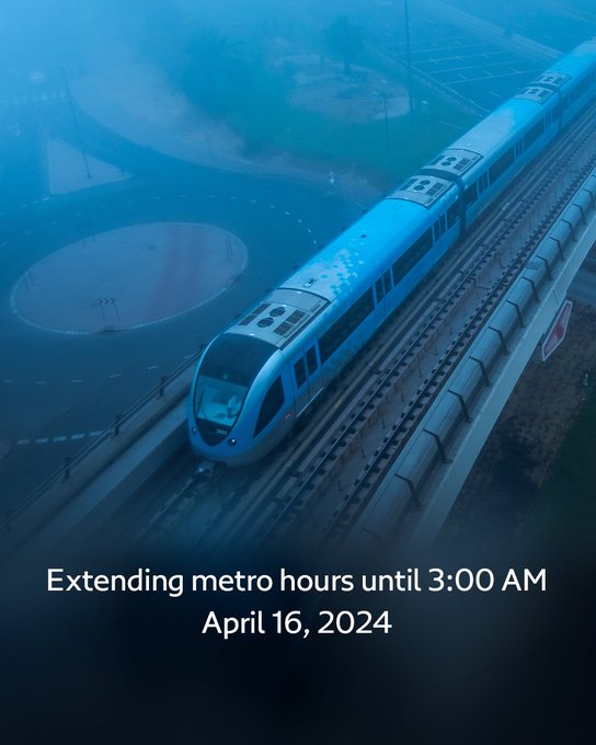 دبئی روڈز اینڈ ٹرانسپورٹ اتھارٹی نے بارش کے دوران میٹرو صارفین کی نقل و حرکت کو آسان بنانے کے لیے 16 اپریل 2024 سے صبح 3:00 بجے تک دبئی میٹرو کے اوقات کار میں توسیع کا اعلان کیا ہے۔