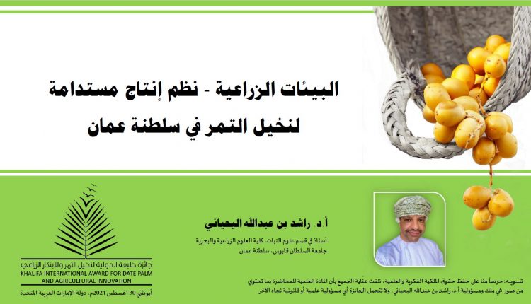 زرعی ماحولیات کے اہداف کے بارے میں بات کرتے ہوئے ڈاکٹر ال یحییٰ نے کہا کہ 5 بنیادی اہداف ہیں: قابل تجدید اور پائیدار زرعی نظام کی تشکیل جو چھوٹے کسانوں کی آمدنی اور زندگی کو بہتر بنائے، تنوع پیدا کرے جس سے خوراک کی پیداوار غیر متوقع موسمی تبدیلیوں کے خلاف زیادہ مزاحم ہو، حیاتیاتی تنوع کو بڑھاتے ہوئے، اور اہم وسائل کو محفوظ رکھتے ہوئے، اور زراعت کو جدید بنانے کے ماحولیاتی اثرات کو کم کرتے ہوئے مناسب خوراک پیدا کرنا۔ انہوں نے زرعی نظام میں کھجور کے درخت کی اہمیت کا بھی جائزہ لیا، کیونکہ کھجور کی کاشت ایک اہم فصل کے طور پر دنیا کے صحرائی علاقوں میں وسیع علاقوں پر قبضہ کرتی ہے، اور مشرق وسطیٰ کے ممالک میں کھجور کی پیداوار عالمی سطح پر سب سے بڑی ہے اور سالانہ بڑھ رہی ہے، کھجوروں اور ان کی مصنوعات کی مانگ میں اضافے کے علاوہ عالمی سطح پر اضافہ ہورہا ہے، جہاں کھجور ایک عنصر کی نمائندگی کرتی ہے یہ دیگر مصنوعات کی کمی کی وجہ سے اس کی کاشت کے علاقوں میں غذائی تحفظ کے لیے اہم ہے، اور یہ کہ کھجور کی کاشت ایک اہم ذریعہ ہے کھجور کی باقیات کی بہت سی ضمنی مصنوعات، اور کھجوروں اور اس سے متعلقہ فصلوں کی کاشت روزگار کا ایک اہم ذریعہ ہے، اور کھجوروں کی معاشی اہمیت کے باوجود، زیادہ تر کھیتوں کے علاقوں میں اس کی کاشت زراعت میں روایتی نظام کی پیروی کرتی ہے۔ کھجور کی کاشت اب بھی پیداوار کے بیشتر ممالک میں، یہاں تک کہ جدید کھیتوں میں بھی رائج ہے، اور پرائمری اور سیکنڈری مٹیریل میں مینوفیکچرنگ اب بھی روایتی ہے، اس کے علاوہ الگ تھلگ اگنے والے علاقوں میں زرعی نظام – صحرا اور پہاڑی نباتات۔ آبادی میں تبدیلی، جو ان نباتات کی خوراک کی حفاظت کے لیے خطرہ ہے۔لیکچر کے اختتام پر، سلطان قابوس یونیورسٹی کے ڈاکٹر راشد ال یحییٰ نے خلیفہ انٹرنیشنل ایوارڈ برائے کھجور اور زرعی انوویشن کی طرف سے دنیا بھر میں کھجور کی کاشت اور کھجور کی پیداوار کے شعبے کی حمایت اور ترقی میں ادا کیے گئے عظیم کردار کی تعریف کی۔