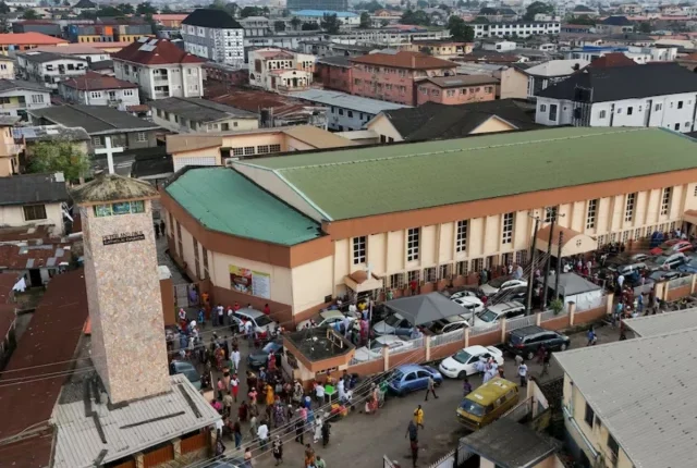 2 نومبر ، 2025 کو نائیجیریا کے پامگروو ، لاگوس میں اتوار کے روز بڑے پیمانے پر سینٹ پیٹر اور پال کیتھولک چرچ سے رخصت ہونے والے عیسائیوں کا ایک ڈرون نظارہ: رائٹرز: رائٹرز