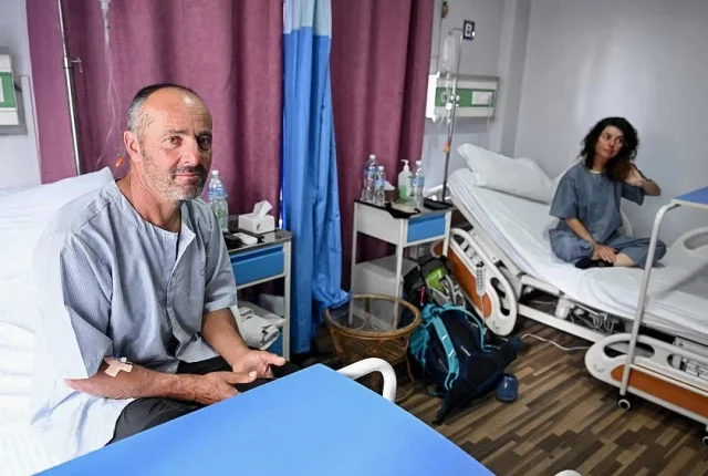 برفانی تودے سے بچ جانے والے فرانس کے ڈیڈیئر ارمند برٹن (ایل) اور اسابیل تھاون 4 نومبر ، 2025 کو کھٹمنڈو کے ایرا اسپتال میں ایک وارڈ کے اندر بیٹھے ہیں۔ تصویر: اے ایف پی