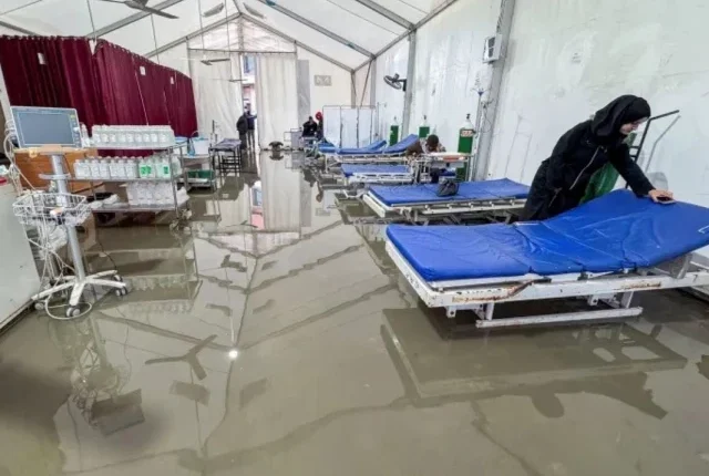 جنوبی غزہ کی پٹی میں خان یونس میں تیز بارش کے بعد ایک فیلڈ ہسپتال میں سیلاب آ گیا ہے۔ تصویر: رائٹرز