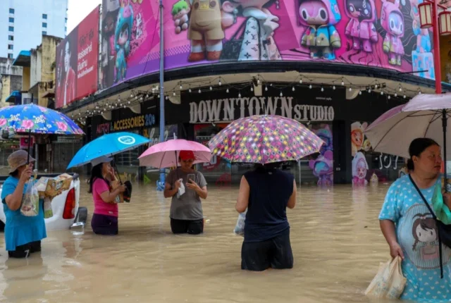 "میں چار دن تک پھنس گیا تھا ،” ایک خاتون نے بارش کا پونچو پہنے اور اپنے بچے کو شہر میں چھتری کے نیچے پکڑ لیا۔ انہوں نے کہا ، "میں نے رخصت ہونے کا فیصلہ کیا کیونکہ میرے پاس ایک نوزائیدہ ہے اور مجھے ڈر ہے کہ مزید پانی آجائے گا۔”