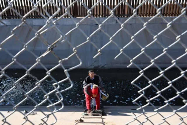 کولمبیا کا ایک خاندان ٹیکساس کے شہر ایل پاسو میں یو ایس میکسیکو کی سرحد کی دیوار میں سوراخ کے نیچے عبور کرنے کے بعد نہر کی باڑ سے گزرتا ہے۔ تصویر: اے ایف پی